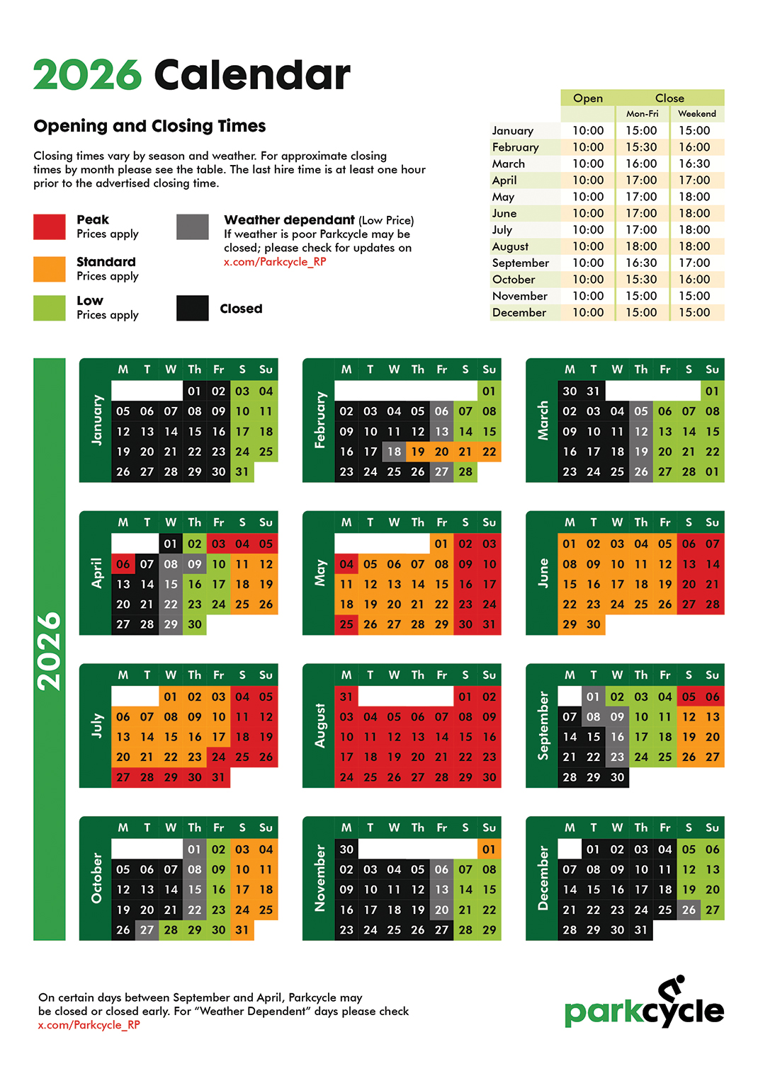 Parkcycle is open most of the year but the daily opening times do vary by season and there are some days we are closed in Low Season and when there is a special event in the park. Enter a date below to see the applicable prices and opening times for that day.